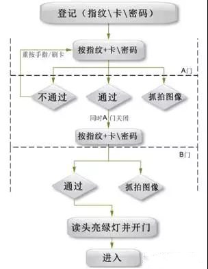 銀行AB二道門 開門人員到A門口,在讀卡器上打指紋或者刷卡,即可開啟A門,同時(shí)攝像機(jī)聯(lián)動(dòng)抓拍,在人員將A門關(guān)閉后即可驗(yàn)證通過B門。