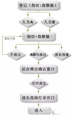 銀行金庫門為重點(diǎn)安全防范區(qū)域,需要多人監(jiān)督驗(yàn)證的情況下打開。為此需采用多人驗(yàn)證開門(指靜脈、指紋等模式)如:人員A指靜脈+人員B指靜脈+后臺(tái)中心管理人員驗(yàn)證,方可開啟金庫門,以防止不法分子用非法途徑獲得開門權(quán)限。