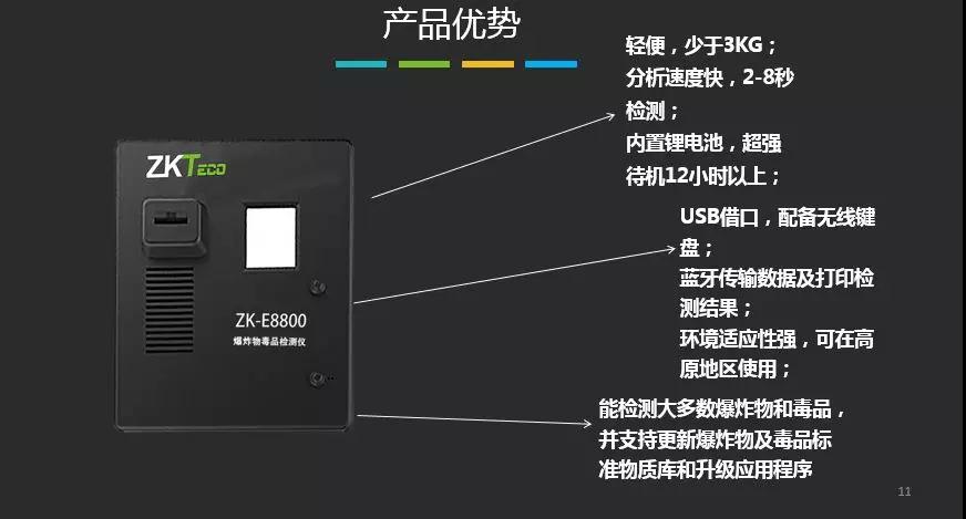便攜式爆炸物毒品探測(cè)儀ZK-E8800是由中控門(mén)禁自主研發(fā)、生產(chǎn)的爆炸物和毒品檢查設(shè)備。該產(chǎn)品基于國(guó)際上先進(jìn)的離子遷移譜(IMS)技術(shù)原理,能夠快速、精準(zhǔn)地檢測(cè)并判斷痕量爆炸物及毒品的種類,具有快速、準(zhǔn)確地檢測(cè)痕量爆炸物、毒品的功能,產(chǎn)品性能達(dá)到同類產(chǎn)品國(guó)際先進(jìn)水平,具有易于使用,耗材成本低和維護(hù)方便等優(yōu)勢(shì)。