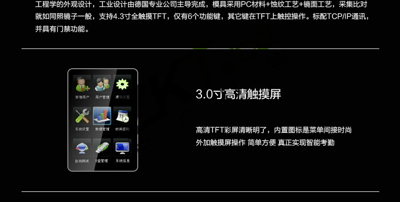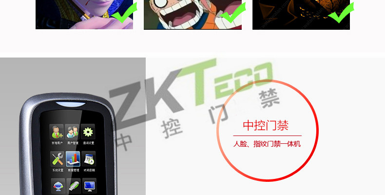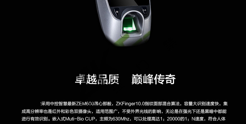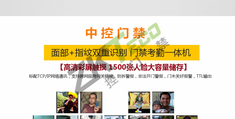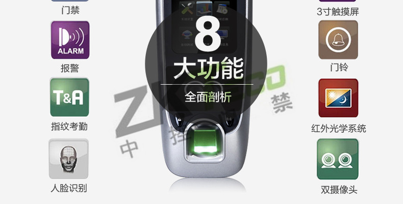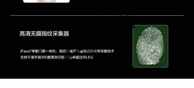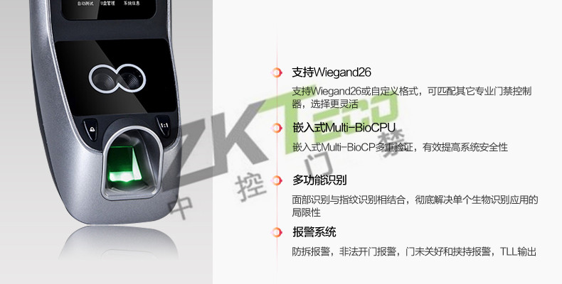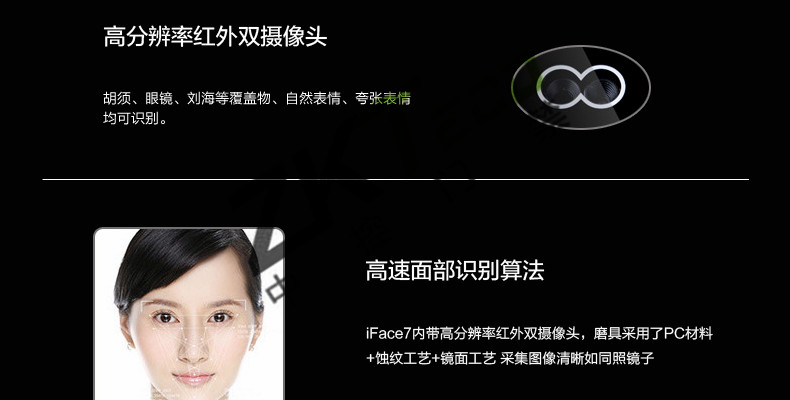 面部門禁一體機(jī)iFace7是基于ZEM800多媒體開發(fā)平臺設(shè)計的一款集指紋和面部混合驗證的3寸觸摸彩屏門禁終端,采用ZKFinger VX10.0最新指紋算法及ZKFace VX7.0面部算法,識別速度快,靈活選擇面部、指紋或者密碼開門方式,集成高分辨率夜市紅外和雙攝像頭功能,適應(yīng)范圍廣。支持高級門禁功能(不同時間段開門,多人開門,拆機(jī)報警,門未關(guān)好報警,門被非法打開報警,開門按鈕輸入,有限門鈴接口,脅迫報警等)。標(biāo)配的TCP/IP通訊,支持跨網(wǎng)段跨網(wǎng)關(guān)連接,是安防工程的首先產(chǎn)品,可用于銀行、部隊、機(jī)場等高安全場所。