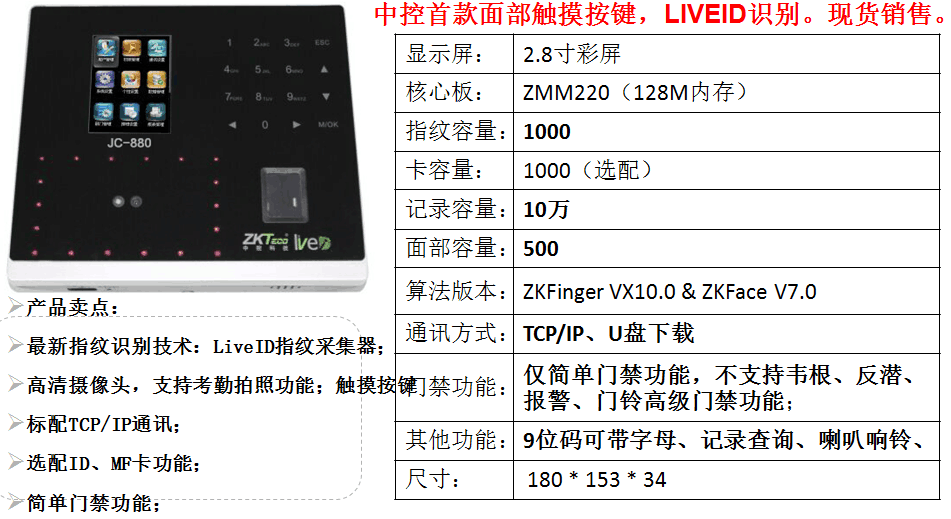 面部識別考勤機(jī)zk-jc880 磁吸式門禁系統(tǒng)