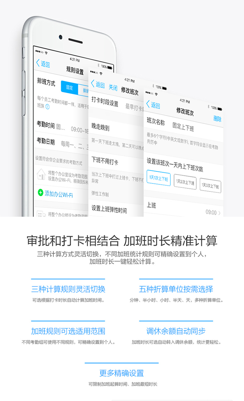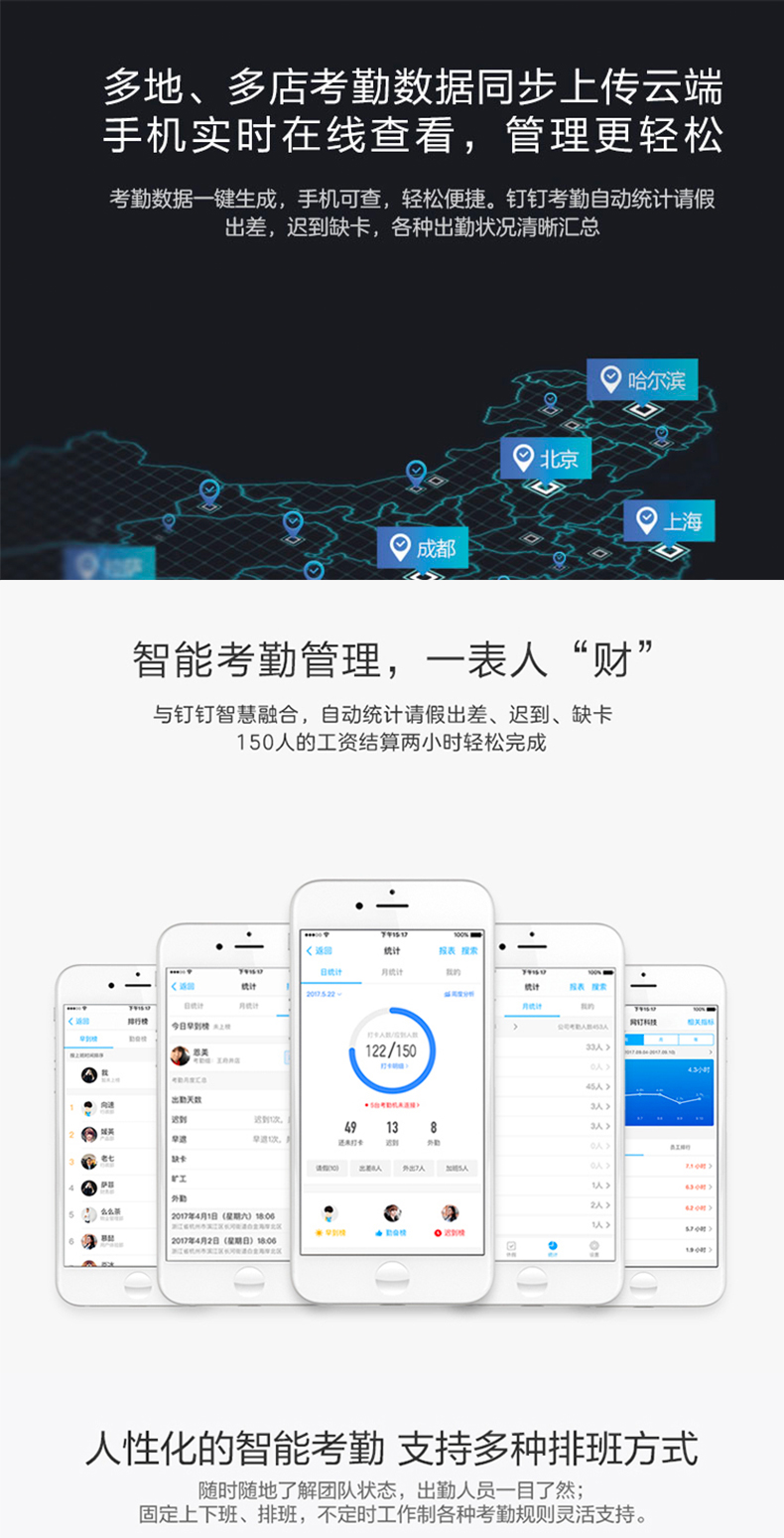 與釘釘智慧融合,釘釘考勤自動統(tǒng)計請假出差、遲到、缺卡,各種出勤狀態(tài)清晰匯總